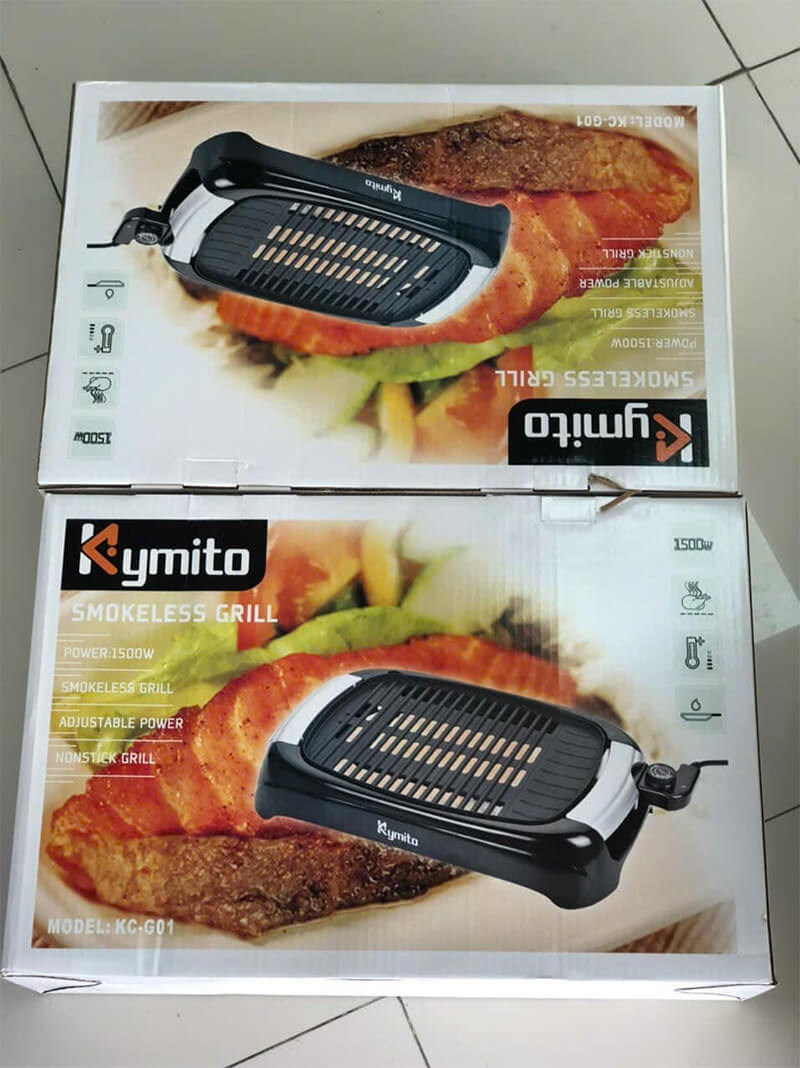 Bếp nướng điện Kymito KC-G01 nguồn điện áp 220V/50Hz, công suất 1500W. Bề mặt nướng chống dính cùng với khay hứng mỡ, thương hiệu Nhật Bản và bảo hành 12 tháng