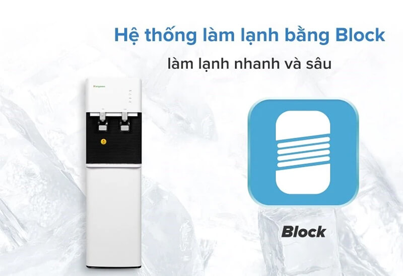 Khác biệt so với nhiều dòng cây nước giá rẻ dùng chip điện tử, Kangaroo KG49A3 áp dụng công nghệ làm lạnh bằng Block, tương tự như tủ lạnh. Nhờ vậy, nước được làm lạnh sâu, nhiệt độ duy trì ổn định, tuổi thọ máy dài hơn. Đặc biệt, Block hoạt động êm ái, hạn chế tiếng ồn, lý tưởng cho văn phòng hoặc phòng họp cần sự yên tĩnh.