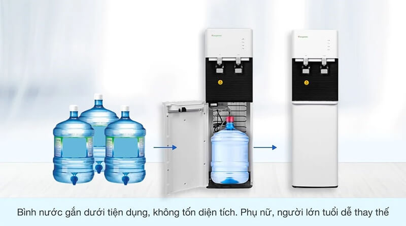 Thay vì phải nâng bình nước nặng lên phía trên như các mẫu cũ, Kangaroo KG49A3 585W được trang bị bình đặt phía dưới, vừa tiện lợi, vừa an toàn. Người dùng chỉ cần mở cánh tủ, đặt bình và kết nối, giúp việc thay bình trở nên dễ dàng hơn bao giờ hết. Thiết kế này còn mang lại sự sang trọng, gọn gàng, hài hòa với nhiều phong cách nội thất.