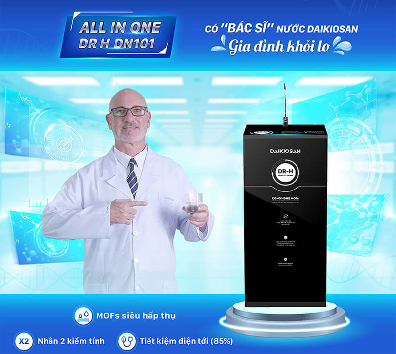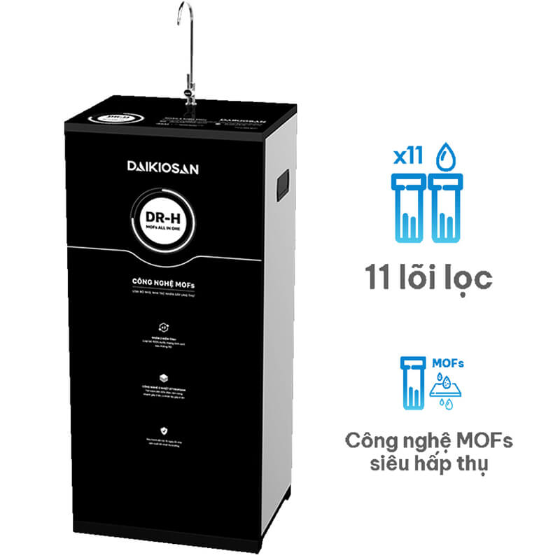 Máy lọc nước RO Daikiosan DN101 Dr.H 2D 11 cấp lọc, công nghệ MOFs và loại bỏ 99,99% vi khuẩn, kim loại nặng, amoni, clo, tạp chất độc hại. Công suất lọc 20 lít/giờ, bình chứa 10 lít và kính cường lực 2D