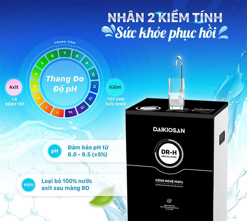 Máy lọc nước RO Daikiosan DN101 Dr.H 2D 11 cấp lọc là lựa chọn hàng đầu cho gia đình hiện đại khi muốn bảo vệ sức khỏe bằng nguồn nước sạch, tinh khiết. Với công nghệ MOFs tiên tiến do Giáo sư Yaghi (Hoa Kỳ) phát minh, sản phẩm có khả năng loại bỏ 99,99% vi khuẩn, kim loại nặng, amoni, clo và tạp chất độc hại. Máy được trang bị 11 cấp lọc, trong đó có lõi nâng kiềm giúp cân bằng pH từ 8 – 9,5 (±0,5), tạo nước kiềm tốt cho hệ tiêu hóa và tim mạch. Công suất lọc 20 lít/giờ, bình chứa 10 lít, màng RO nhập khẩu từ Mỹ – Hàn Quốc cùng thiết kế kính cường lực 2D hiện đại giúp sản phẩm vừa bền bỉ vừa sang trọng. Đặc biệt, máy đạt chuẩn QCVN 6-1:2010/BYT về nước uống trực tiếp tại vòi, bảo hành chính hãng toàn quốc.