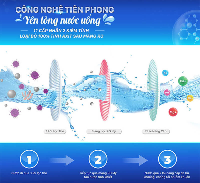 - 11 lõi lọc chuyên sâu, nhân đôi kiềm tính, tạo nước pH 8 – 9,5 tốt cho sức khỏe.