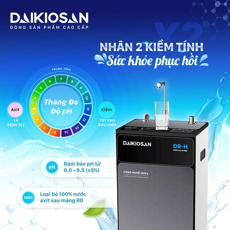 Máy lọc nước RO Daikiosan DN202 Dr.H nóng nguội 3D còn giúp nâng pH của nước lên mức 9.0 – 9.5, tạo ra nước kiềm tự nhiên giàu ion khoáng.