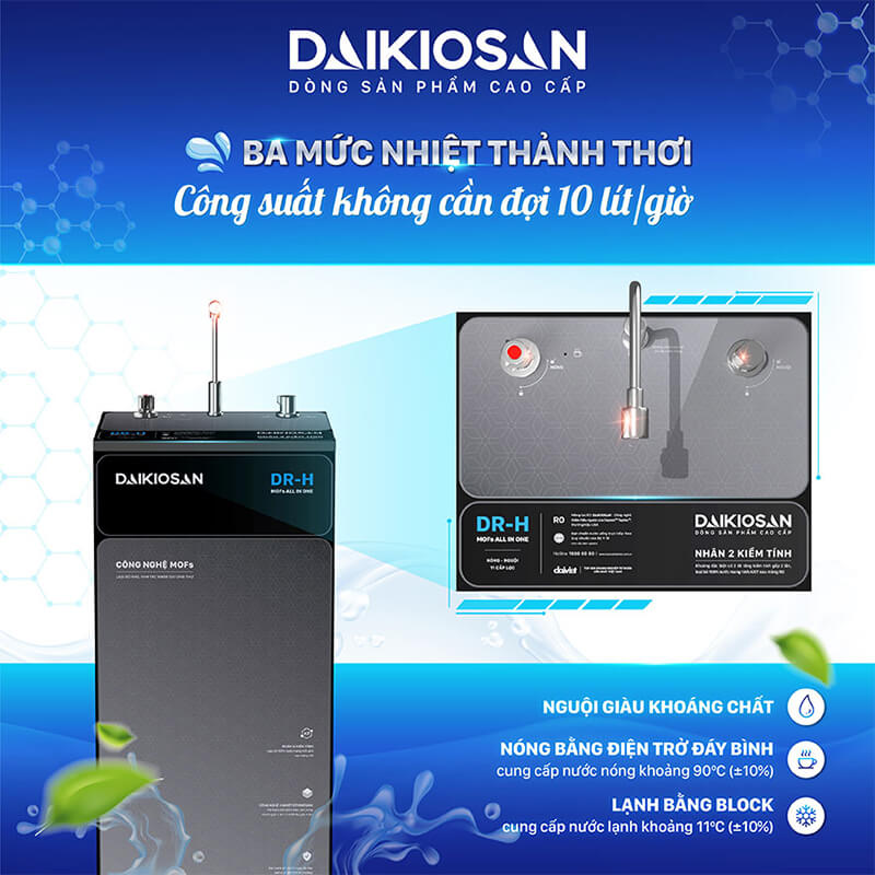 Máy lọc nước RO Daikiosan DN202 Dr.H nóng nguội 3D, 11 cấp lọc, công nghệ thẩm thấu ngược RO. Lõi lọc MOFs, mặt kính in 3D và cảm biến điện – nhiệt an toàn kép, cung cấp nước nóng tới 90°C (±10%)