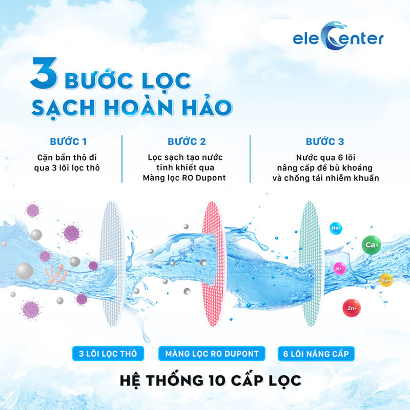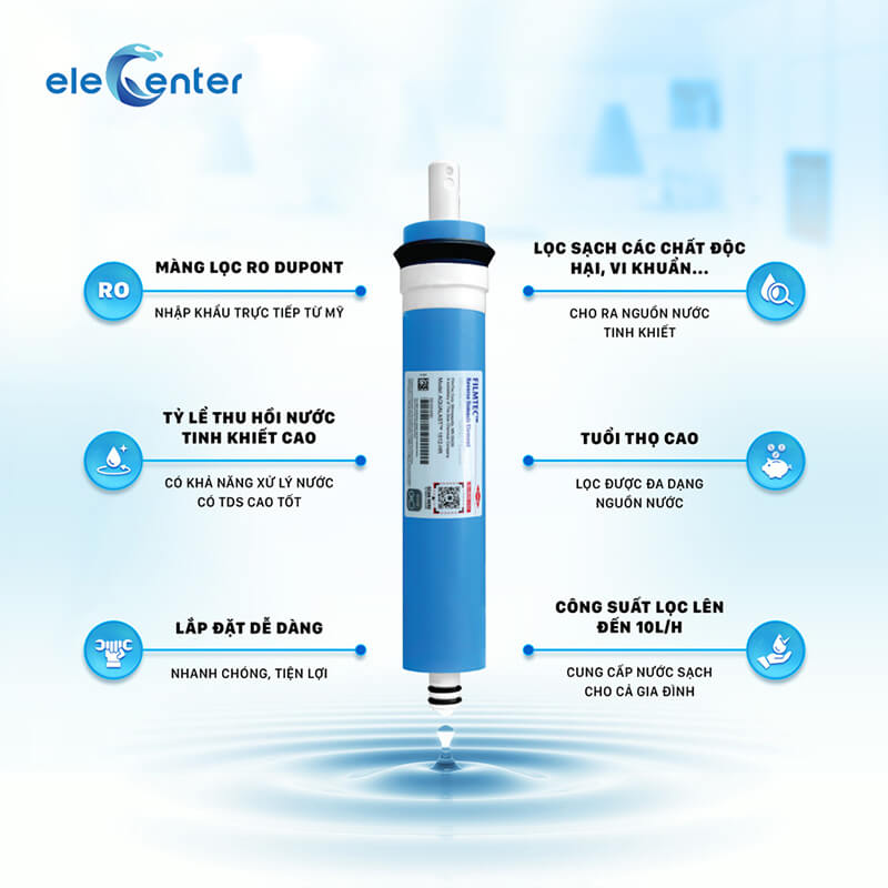 Màng RO thẩm thấu ngược với lỗ lọc siêu nhỏ 0.1 – 0.5 nanomet, loại bỏ đến 99% vi khuẩn, virus, kim loại nặng và tạp chất độc hại. - Bộ lõi nâng cấp, bổ sung khoáng chất