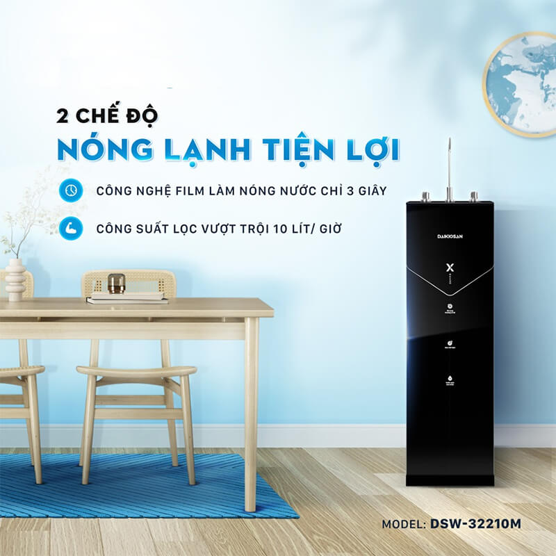 Daikiosan DSW-32210M có công suất lọc 18 – 20 lít/giờ, đảm bảo cung cấp nước cho cả gia đình hoặc văn phòng. Đặc biệt, tính năng làm nóng tức thì chỉ trong 3 giây, cho nước đạt đến 90°C, giúp tiết kiệm 75% điện năng so với bình đun truyền thống.
