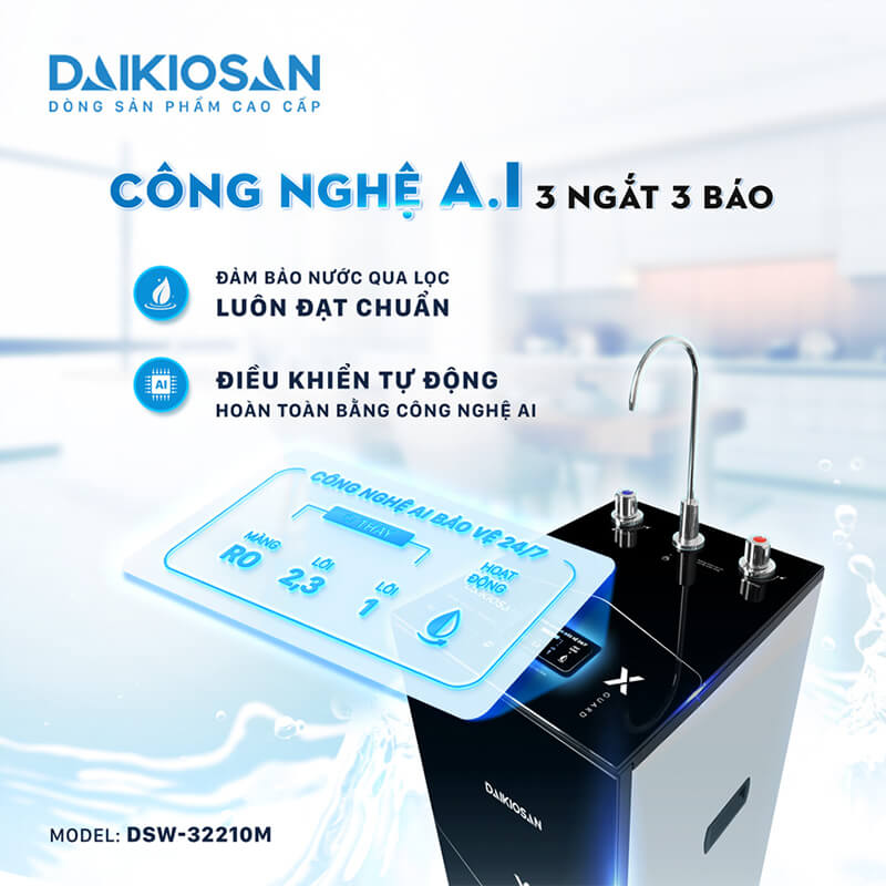Máy lọc nước RO Daikiosan DSW-32210M X-Guard nóng nguội, hệ thống 10 cấp lọc. Công nghệ AI 3 ngắt – 3 báo, công suất lọc 18 – 20 lít/giờ và mặt kính cường lực 2D