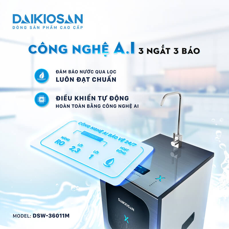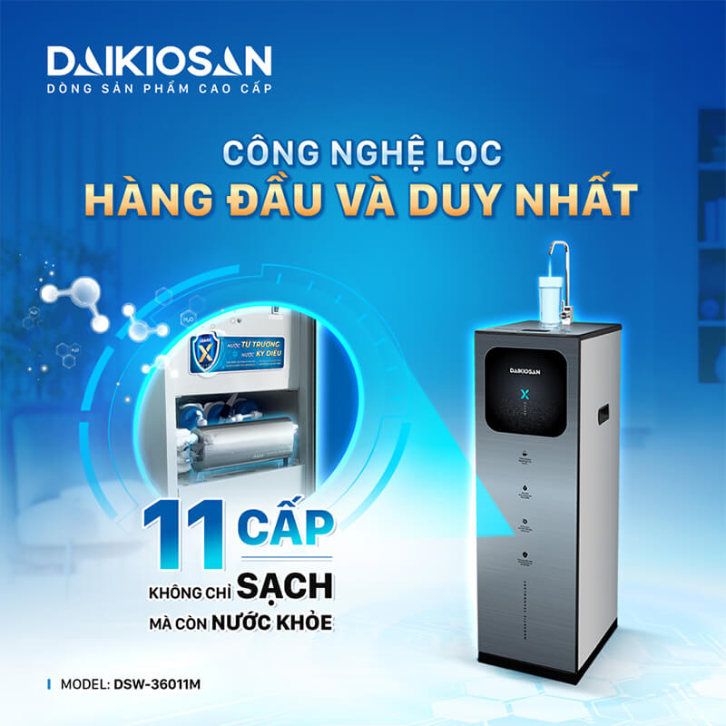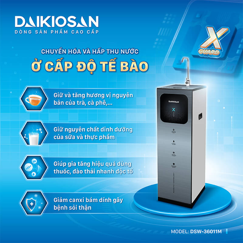 Máy lọc nước RO Daikiosan DSW-36011M X-Guard từ trường, 11 cấp lọc, công suất lọc 18-20 lít/giờ, bình chứa nước từ trường dung tích 10 lít. Công nghệ AI bảo vệ 24/7, lõi điện từ trường và mặt kính cường lực in 3D