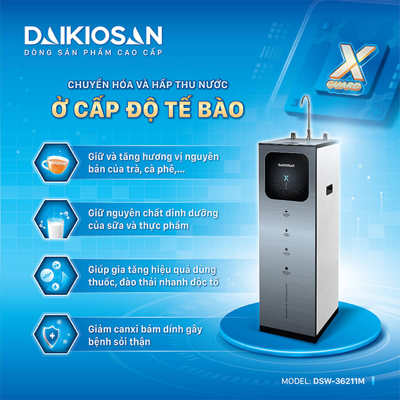 Điểm khác biệt nổi bật của Daikiosan DSW-36211M X-Guard từ trường nóng nguội là công nghệ điện từ trường độc quyền. Công nghệ này tái cấu trúc phân tử nước thành dạng lục giác, gần giống với nước khoáng tự nhiên, nhờ đó cơ thể hấp thụ nhanh chóng và hiệu quả hơn.