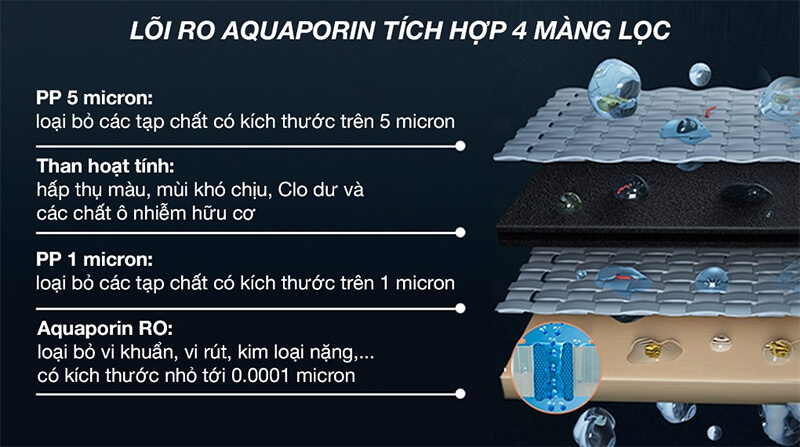 Hệ thống lọc RO AquaShield tích hợp có khả năng loại bỏ chì, thủy ngân, clo, vi khuẩn, thuốc trừ sâu cùng hơn 100 loại tạp chất khác. Kết hợp với công nghệ Aquaporin Inside®, sản phẩm không chỉ đảm bảo hiệu quả lọc cao mà còn giảm lãng phí nước thải. Nguồn nước đầu ra đạt chuẩn tinh khiết, tương đương nước cất, mang lại sự an tâm tuyệt đối cho người dùng.