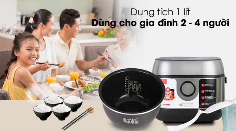 Với dung tích 1 lít, nồi cơm điện Toshiba cao tần 1 lít phù hợp cho từ 2 đến 4 người ăn. Đây là lựa chọn tuyệt vời cho gia đình nhỏ, cặp đôi hoặc người sống độc thân đang tìm một sản phẩm nấu ăn gọn nhẹ, tiết kiệm điện năng và không gian.