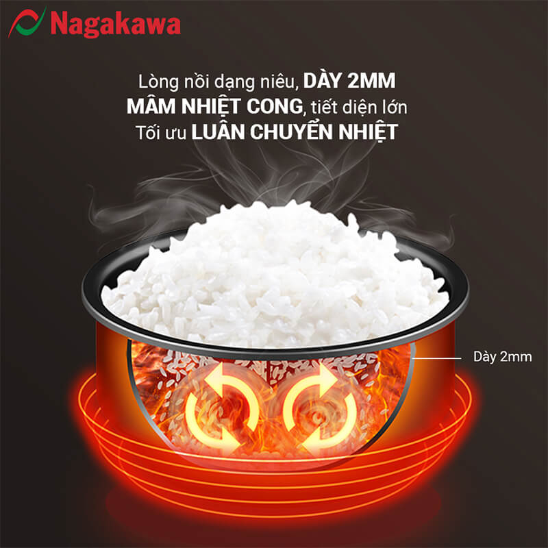 Không giống các nồi cơm thông thường, nồi cơm điện tử Nagakawa NAG0135 1.8L được trang bị mâm nhiệt lớn dạng cong ôm sát lòng nồi. Nhờ vậy, nhiệt lượng tỏa đều khắp, giúp cơm chín nhanh, dẻo ngon và không bị nửa sống nửa chín.