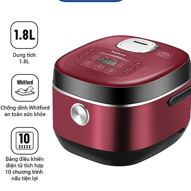 Nồi cơm điện tử Nagakawa NAG0135 lòng nồi dạng niêu phủ chống dính Whitford cao cấp từ Mỹ, công suất 900W. Dung tích 1.8L, 10 chương trình nấu và bảng điều khiển điện tử tiếng Việt