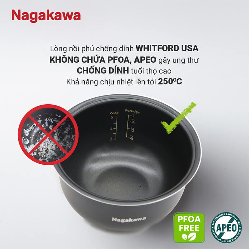 Nagakawa NAG0136 được trang bị lớp chống dính Whitford cao cấp từ Mỹ, nổi tiếng với độ bền và tính an toàn.